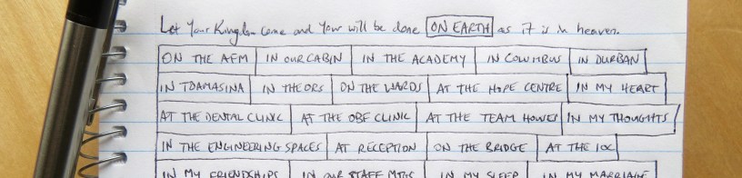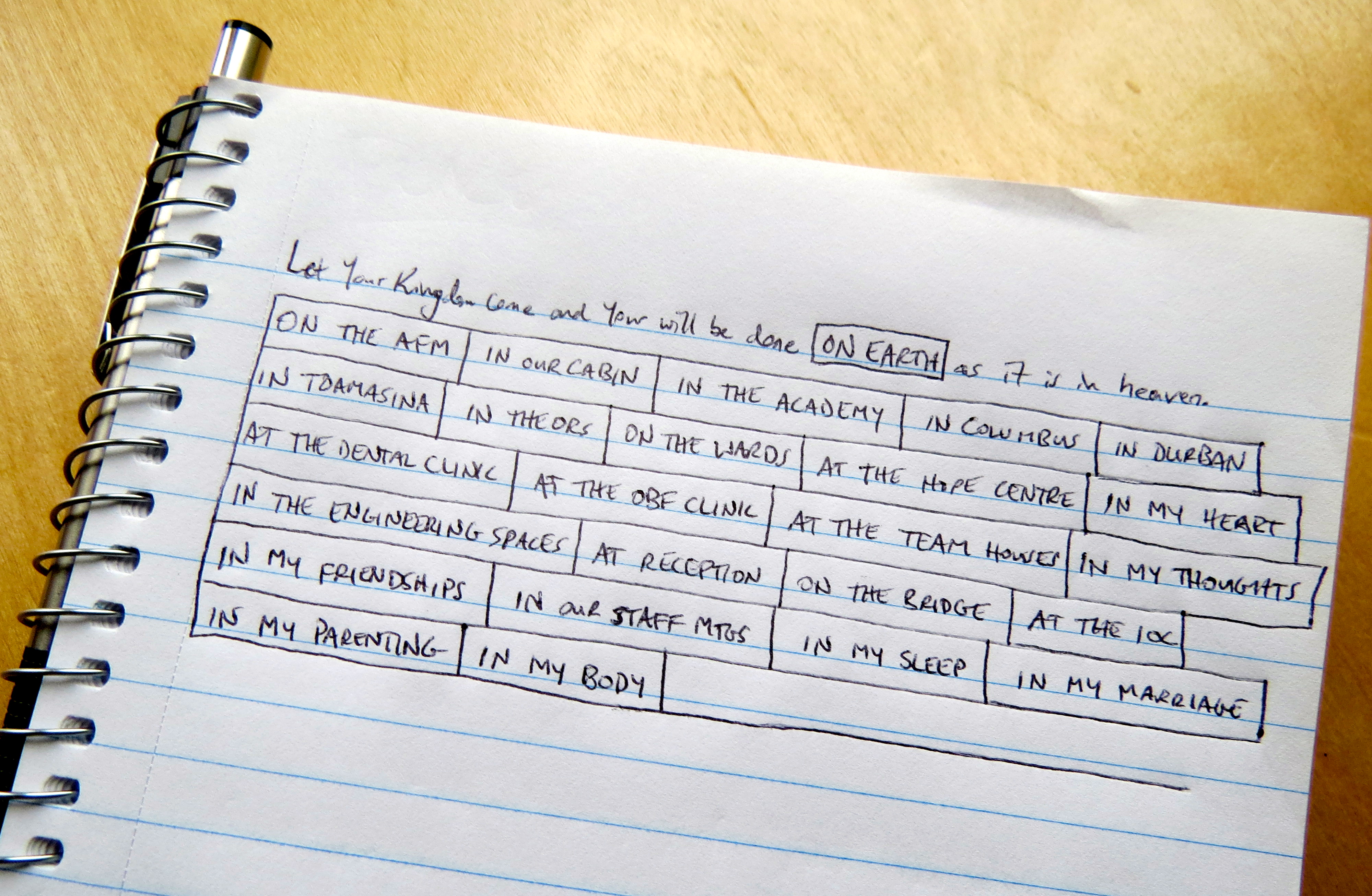 Following the prayer model provided by Jesus, I decided to let this sentence be a template for my prayers, replacing the words “on earth” with other personalized places and locations that I wanted to specifically ask for God’s kingdom to come and His will to be done: